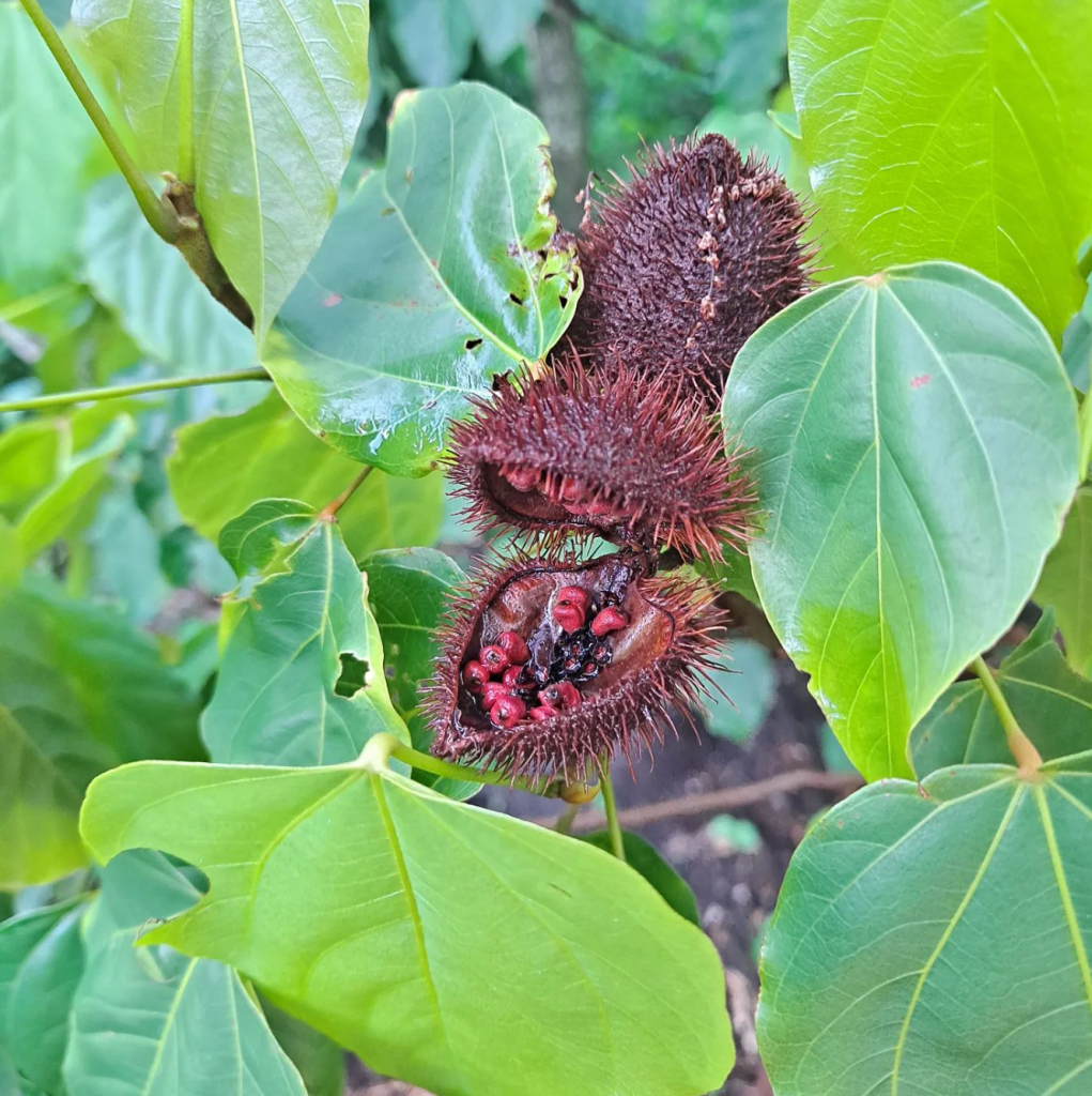 Annatto is a small evergreen shrub or tree that grows up to 20 feet tall, producing heart-shaped leaves and clusters of pink flowers, followed by spiny seed pods containing the red-orange seeds used as a natural food coloring and flavoring in various cuisines. It thrives in tropical and subtropical climates, requiring full sun and well-drained soil, and is often propagated by seeds or cuttings, making it a robust addition to food forests for its ease of cultivation and multiple uses. Annatto’s vibrant seeds are harvested in the late summer to early fall, providing both culinary and ecological benefits as they attract pollinators and contribute to biodiversity.