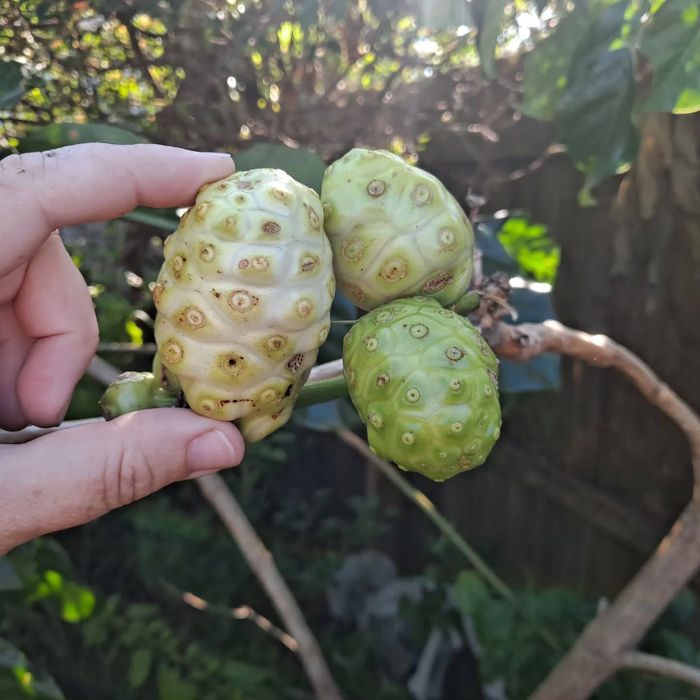 Noni (Morinda citrifolia) is a tropical evergreen shrub or small tree known for its large, glossy leaves and distinctive, fragrant fruit with traditional medicinal uses. It grows best in full sun to part shade with well-drained soil and regular watering. The fruit and leaves have been used in folk medicine for their anti-inflammatory and immune-supporting properties, though the fruit’s strong taste means it’s often processed before consumption.