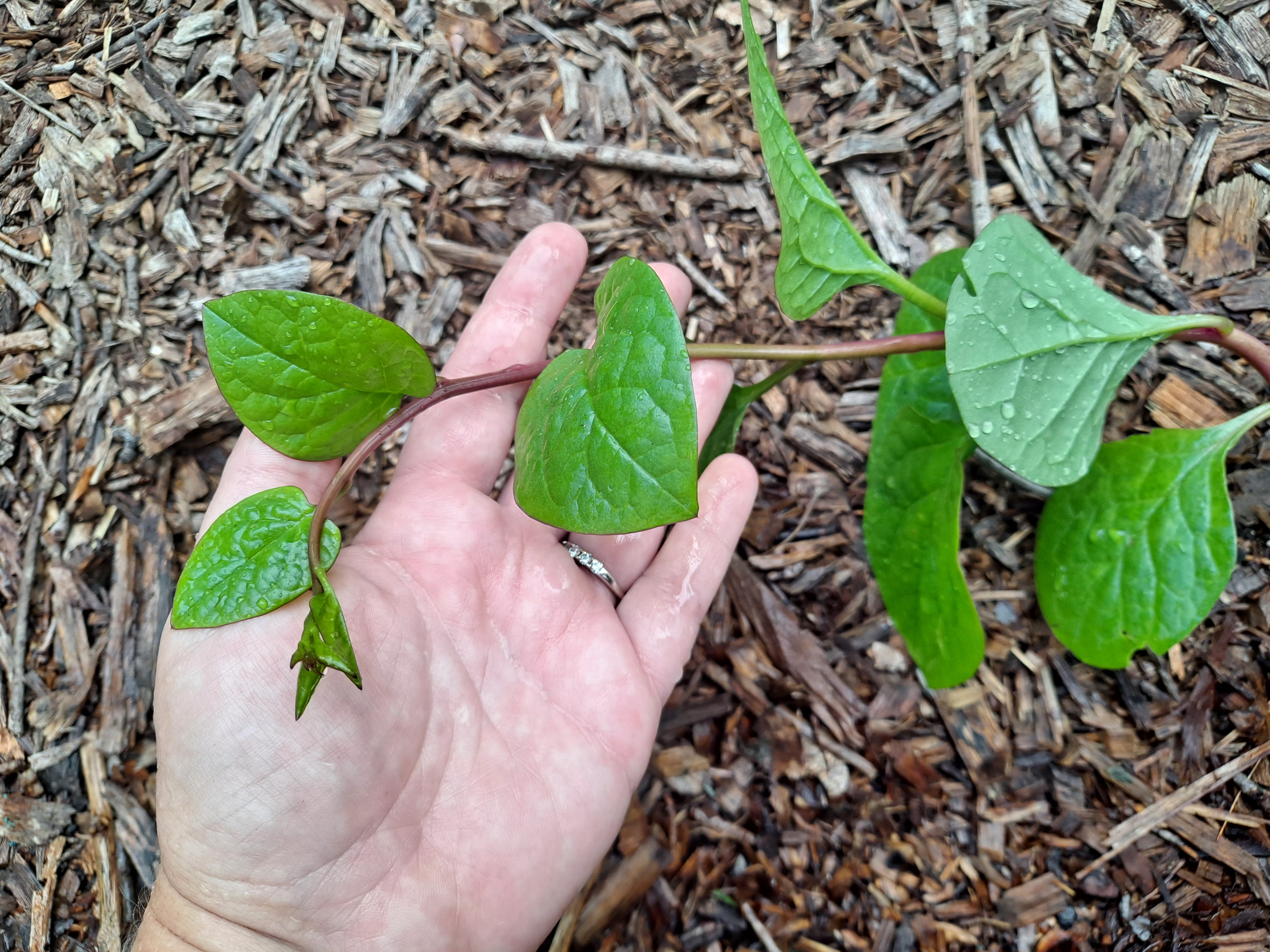 Malabar spinach is a vigorous, sprawling vine that can grow up to 10-15 feet long, producing thick, succulent leaves used as a nutritious, spinach-like green in salads, soups, and stir-fries. It thrives in warm, tropical to subtropical climates with full sun to partial shade and well-drained soil, making it an excellent addition to food forests for its edible leaves and ability to provide ground cover. The plant is typically propagated by seeds or cuttings, requires regular watering, and benefits from support for its climbing habit, with peak growth and leaf production occurring during the warmer months.